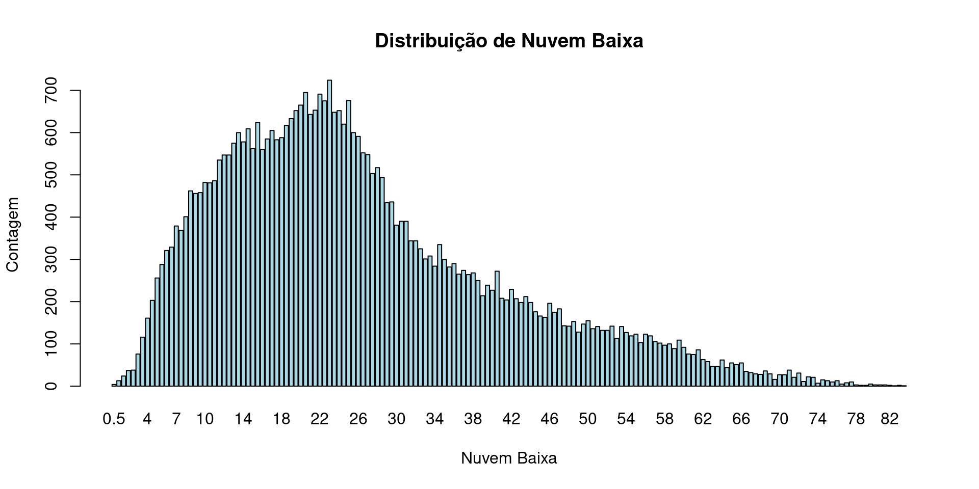 Utilizando o pacote de gráficos base do R, crie um gráfico de barras para representar a distribuição da variável categórica “nuvem_baixa”. Adicione rótulos aos eixos.