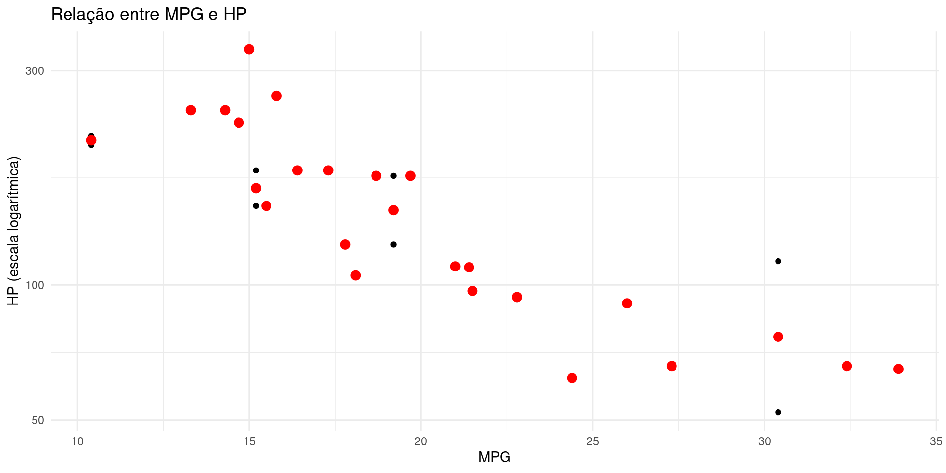 Quando precisamos representar variáveis em escalas diferentes, podemos usar a função scale_x_log10() ou scale_y_log10() para poder visualizar os dados de forma mais clara. No exemplo abaixo queremos comparar duas regressões que tem ordem de grandeza diferente, para isso usamos a escala logarítmica no eixo y.