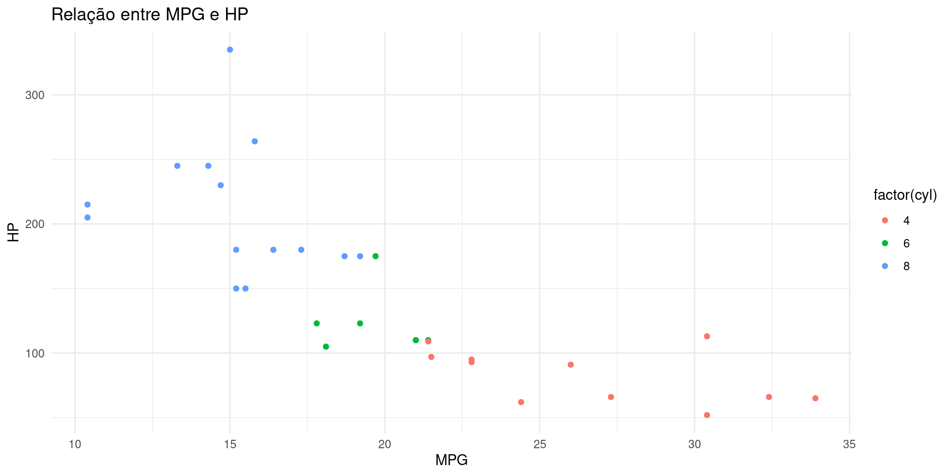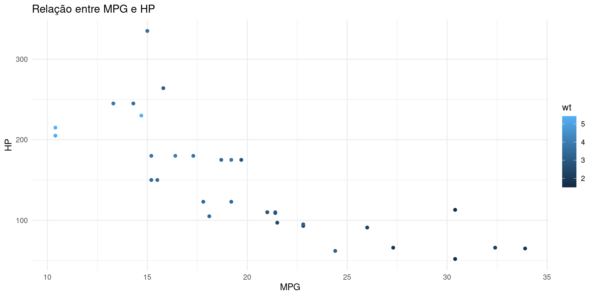 Se quisermos definir uma cor especifica temos que tomar cuidado com a localização do argumento color, por exemplo, se quisermos que todos os pontos sejam vermelhos, devemos colocar o argumento color dentro da função geom_point mas fora da função aes. Mas se quisermos mapear uma variável contínua para as cores dos pontos, devemos colocar o argumento color dentro da função aes.