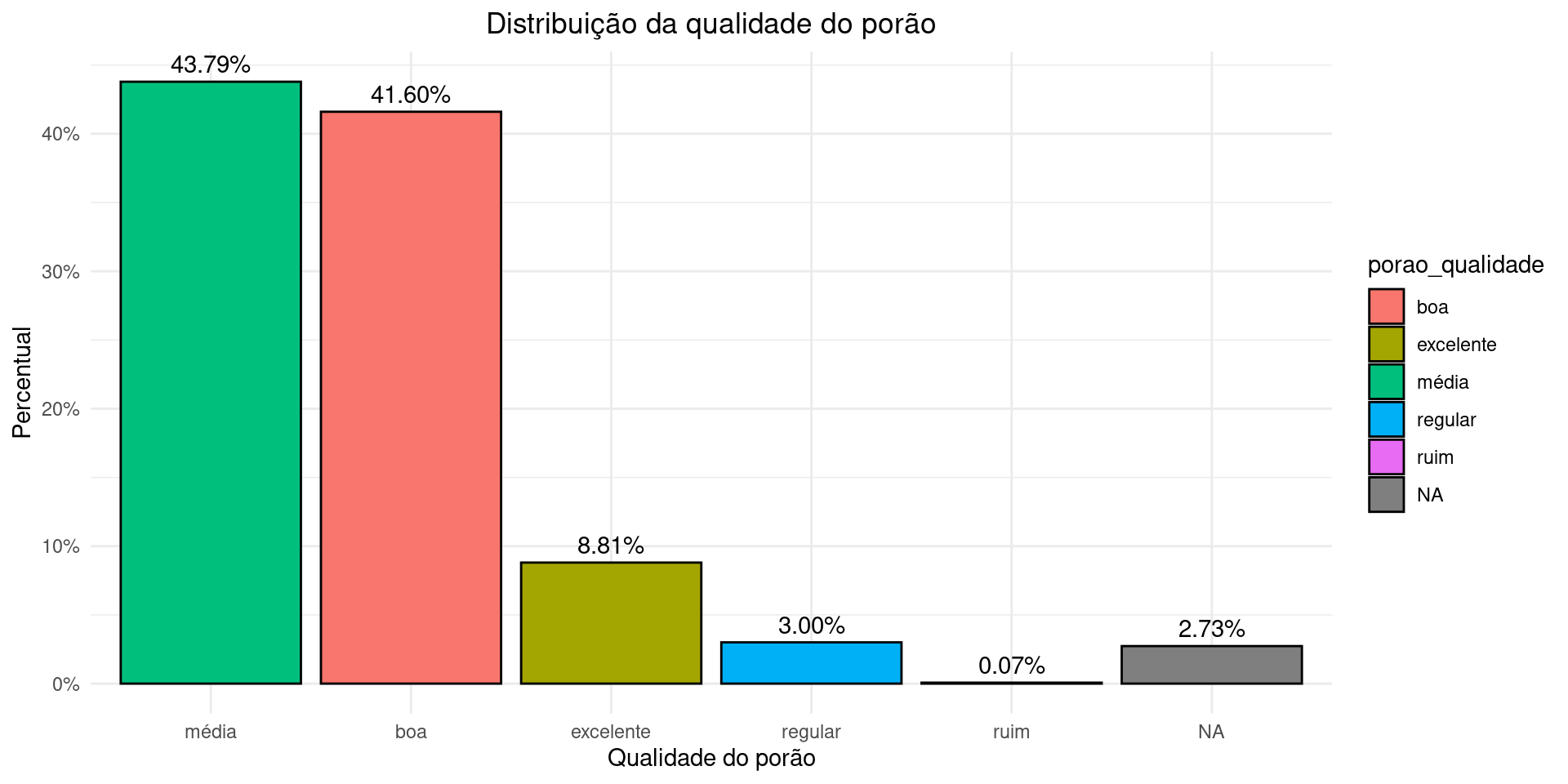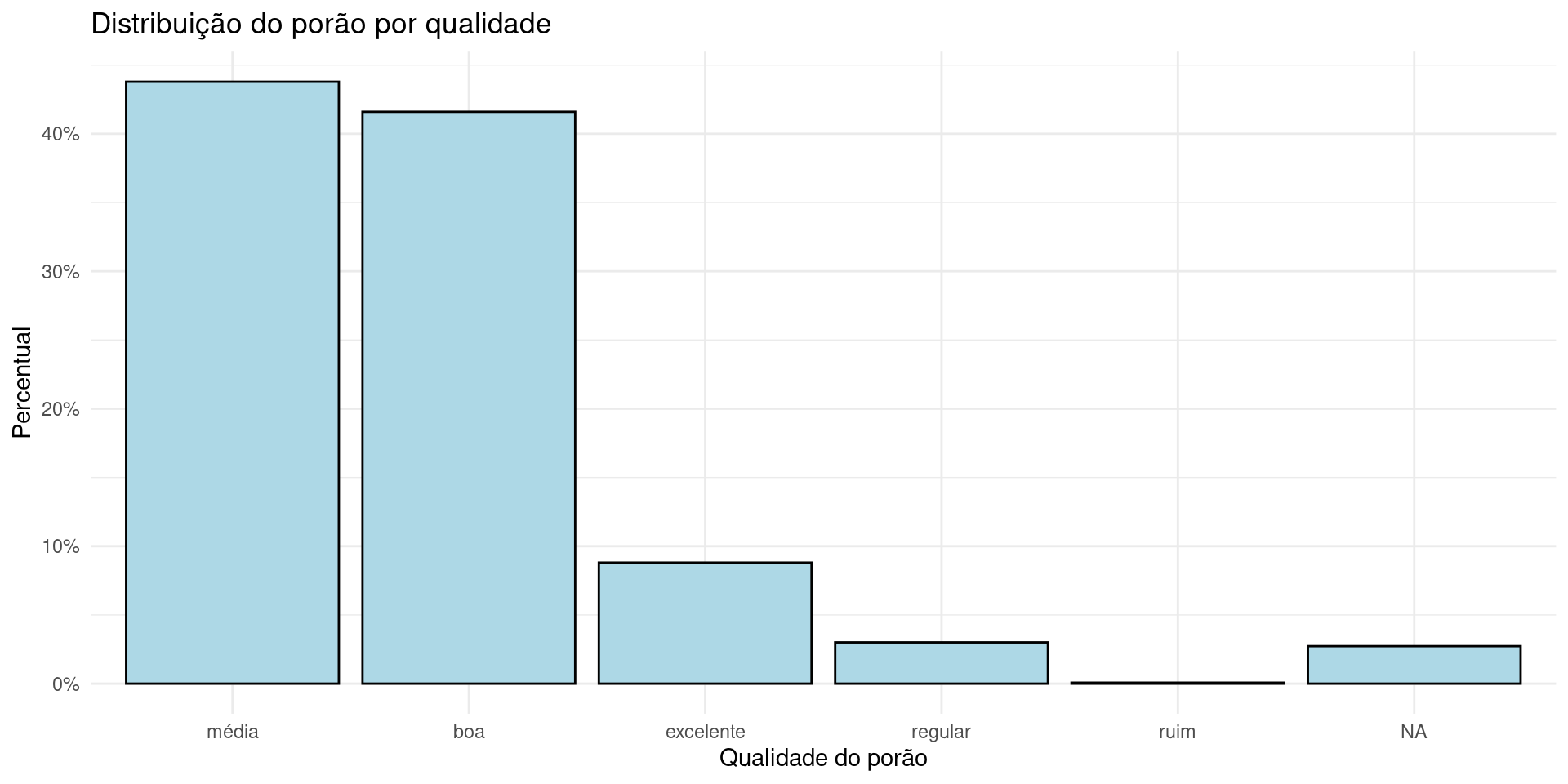 labs(title = "Distribuição da qualidade do porão", x = "Qualidade do porão", y = "Percentual") +