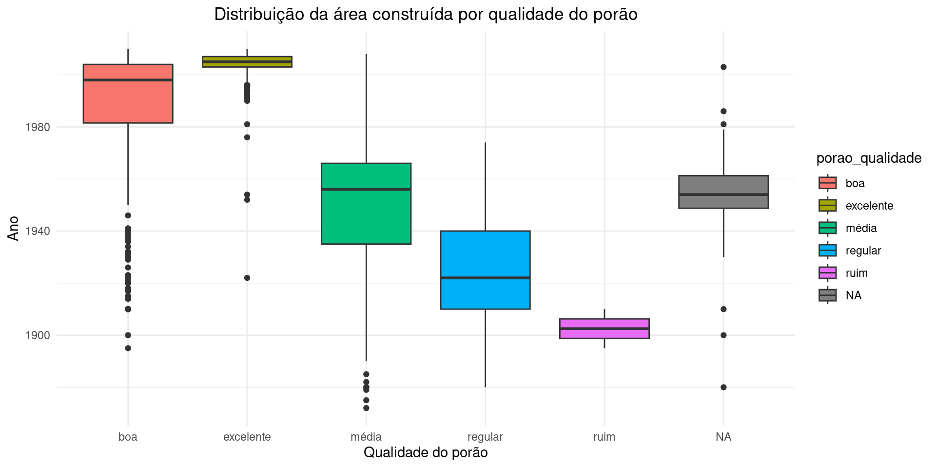 labs(title = "Distribuição da área construída por qualidade do porão", x = "Qualidade do porão", y = "Ano") +