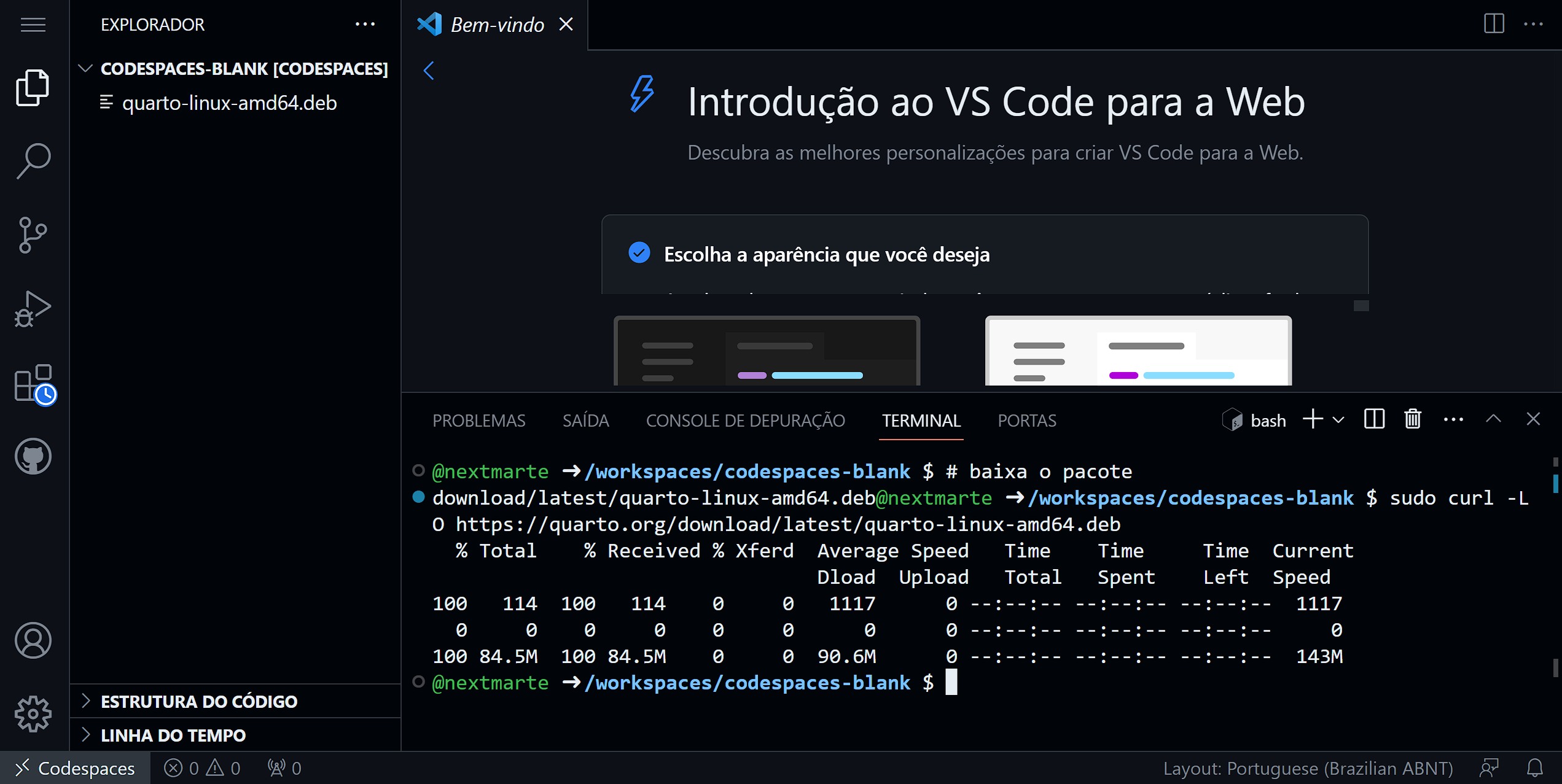 /usr/local/bin/quarto checkobs.: a documentação oficial sugere o uso do comando gdebi porém ele não está disponível por padrão na distribuição linux do codespaces, por isso usei o dpkg.