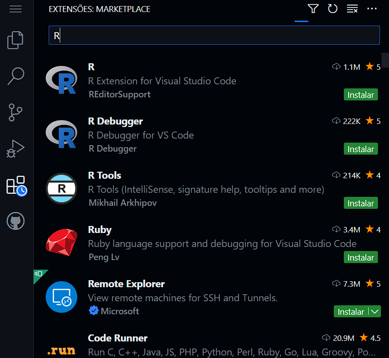 Para usar o R e o QUARTO vamos precisar instalar as extensões do VScode, para isso clique no ícone de extensões no menu lateral esquerdo e digite R no campo de busca e instale a extensão R. Repita o processo para instalar a extensão Quarto.