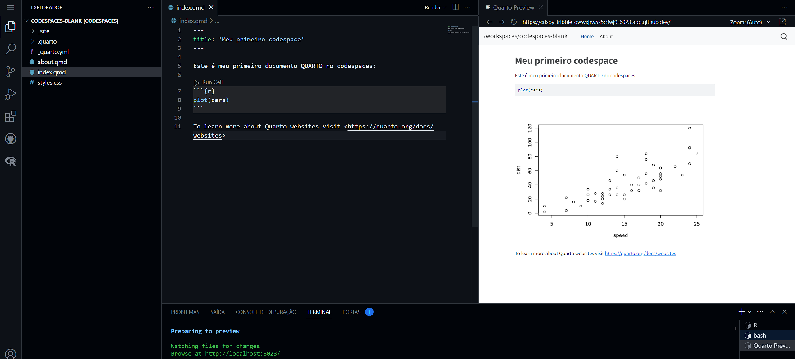 Neste post eu mostrei como criar um codespace no github e como instalar o R e o QUARTO. Também mostrei como criar um projeto quarto e renderizar o arquivo index.qmd. O processo parece trabalhoso, mas só precisa ser feito uma vez pois o codespaces nada mas é do que um container com o ambiente de desenvolvimento que você precisa para trabalhar, assim é possível manter um ambiente único para toda uma turma, por exemplo.