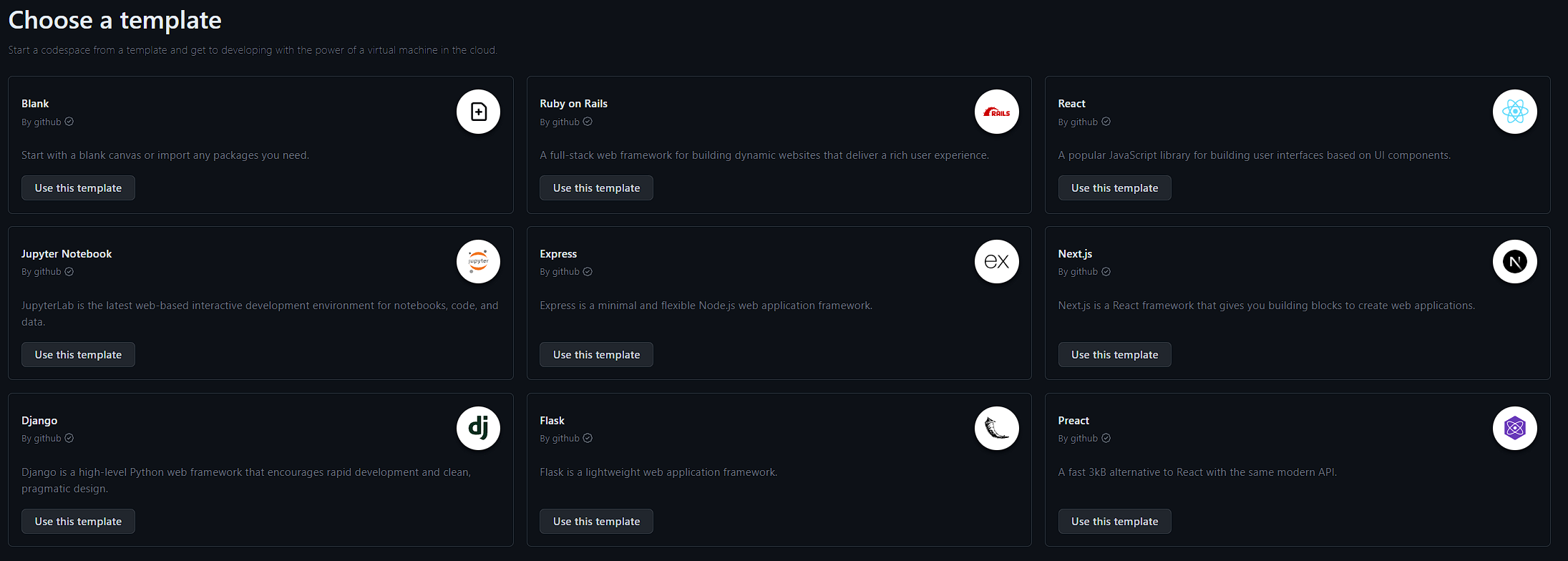 Acesse o Codespaces e clique em Get started for free. Serão exibidas diversas opções de template, esses templates já vem com o ambiente de desenvolvimento pré-configurado para outras linguagens e frameworks, mas como vamos instalar o Quarto e o R, escolha a opção Blank.